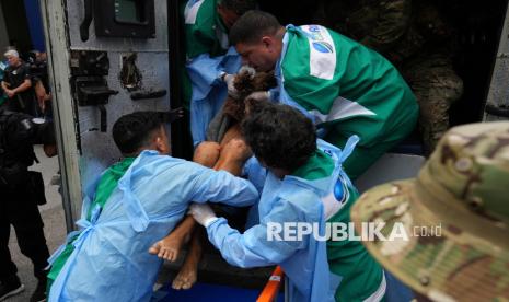 Petugas Rumah Sakit Getulio Vargas mengeluarkan seorang korban luka dari truk polisi dalam operasi penggerebekan bandar narkoba di Rio de Janeiro, Selasa (28/10/2025). Pemerintah Brasil melaporkan korban tewas dalam operasi penggerebekan bandar narkoba itu mencapai 64 orang, di mana 60 di antaranya diduga anggota geng narkoba, sementara 4 sisanya polisi. Operasi penggerebekan bandar narkoba itu disebut sebagai yang terbesar dalam sejarah negara bagian Rio de Janeiro. (FOTO : AP Photo/Silvia Izquierdo)