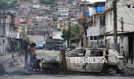 Sisa mobil yang terbakar yang digunakan sebagai barikade oleh terduga pengedar narkoba selama operasi polisi di favela Complexo do Alemao tempat organisasi kriminal Comando Vermelho beroperasi di Rio de Janeiro, Selasa (28/10/2025). Pemerintah Brasil melaporkan korban tewas dalam operasi penggerebekan bandar narkoba itu mencapai 64 orang, di mana 60 di antaranya diduga anggota geng narkoba, sementara 4 sisanya polisi. Operasi penggerebekan bandar narkoba itu disebut sebagai yang terbesar dalam sejarah negara bagian Rio de Janeiro. (FOTO : AP Photo/Silvia Izquierdo)