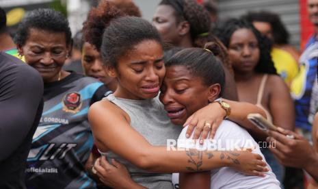 Warga menangis di samping jenazah korban operasi penggerebekan pengedar narkoba di Rio de Janeiro, Brasil, Rabu (29/10/2025) waktu setempat. Pemerintah Brasil melaporkan korban tewas dalam operasi penggerebekan bandar narkoba itu mencapai 64 orang, di mana 60 di antaranya diduga anggota geng narkoba, sementara 4 sisanya polisi. Operasi penggerebekan bandar narkoba itu disebut sebagai yang terbesar dalam sejarah negara bagian Rio de Janeiro. (FOTO : AP Photo/Silvia Izquierdo)