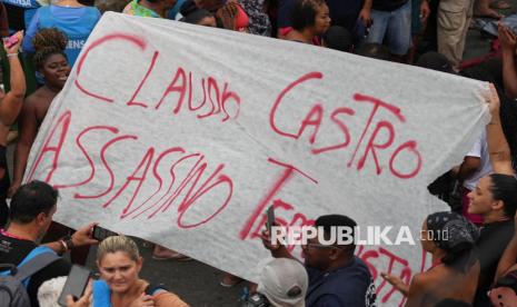 Para pengunjuk rasa membentangkan spanduk protes untuk Gubernur negara bagian Rio de Janeiro Claudio Castro, sehari setelah penggerebekan polisi mematikan yang menargetkan geng Comando Vermelho di favela Complexo da Penha di Rio de Janeiro, Brasil, Rabu (29/10/2025) waktu setempat. Pemerintah Brasil melaporkan korban tewas dalam operasi penggerebekan bandar narkoba itu mencapai 64 orang, di mana 60 di antaranya diduga anggota geng narkoba, sementara 4 sisanya polisi. Operasi penggerebekan bandar narkoba itu disebut sebagai yang terbesar dalam sejarah negara bagian Rio de Janeiro. (FOTO : AP Photo/Silvia Izquierdo)