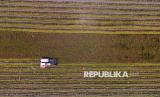 Mesin Combine Harvester memanen padi di areal persawahan Desa Lebo jaya, Kabupaten Konawe Selatan, Sulawesi Tenggara, Rabu (29/10/2025). Perum Bulog Kantor Wilayah Sulawesi Tenggara telah menyerap sekitar 15 ribu ton gabah kering panen (GKP) hingga Oktober 2025 serta meminta para mitra membeli gabah petani sesuai dengan Harga Pembelian Pemerintah (HPP) agar kesejahteraan petani semakin meningkat sekaligus menjaga stabilitas pasokan dan harga beras di Sulawesi Tenggara menjelang akhir tahun 2025. (FOTO : ANTARA FOTO/Andry Denisah)