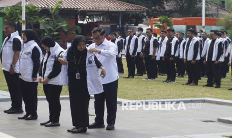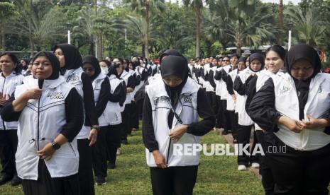 REPUBLIKA.CO.ID, JAKARTA -- Sejumlah anggota Pasukan Putih mengenakan rompi saat pelepasan di halaman Balai Kota Jakarta, Jakarta, Rabu (29/10/2025).