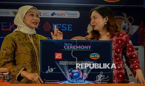 Co-founder & Chief Marketing Officer DOKU Himelda Renuat (kiri) dan Chief Executive Officer ALTO Network Gretel Griselda saat penandatanganan nota kesepahaman (MoU) terkait kerja sama strategis implementasi layanan QRIS lintas negara di Jakarta, Kamis (30/10/2025). Kerja sama tersebut untuk memperluas jangkauan adopsi QRIS lintas negara DOKU dalam memproses transaksi di Malaysia dan Thailand melalui pemanfaatan jaringan interkoneksi ALTO. (FOTO : Dok Republika)
