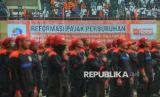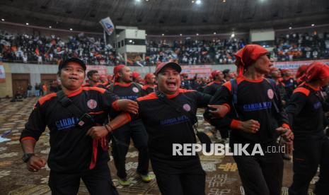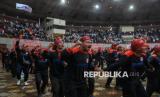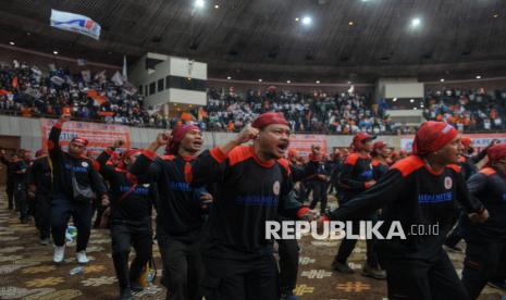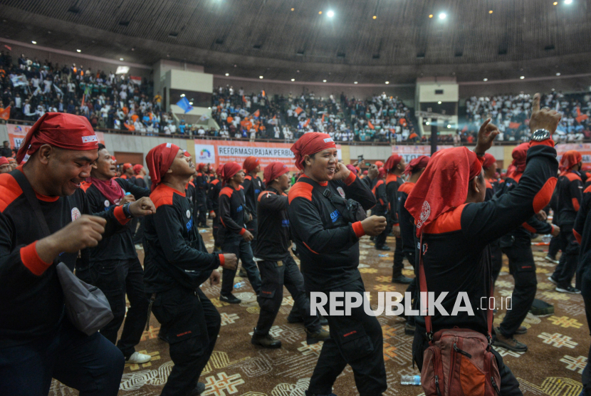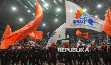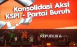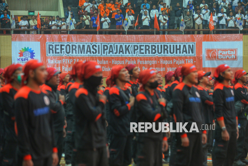 Buruh menghadiri Konsolidasi Aksi Konfederasi Serikat Pekerja Indonesia (KSPI) dan Partai Buruh di Jakarta International Convention Center (JICC), Senayan, Jakarta, Kamis (30/10/2025). Konsolidasi tersebut menyuarakan Hapus Outsourcing dan Tolak Upah Murah (HOSTUM) untuk memperjuangkan kesejahteraan buruh, termasuk tuntutan kenaikan upah hingga 10,5 persen pada 2026. (FOTO : Republika/Prayogi)