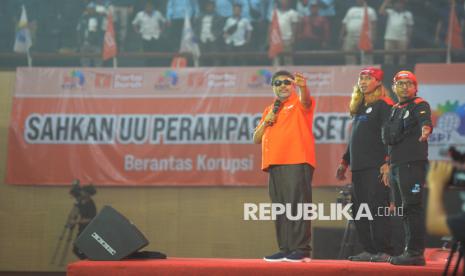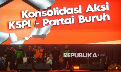 Presiden Konfederasi Serikat Pekerja Indonesia (KSPI) dan Partai Buruh Said Iqbal menyampaikan orasi dalam Konsolidasi Aksi Konfederasi Serikat Pekerja Indonesia (KSPI) dan Partai Buruh di Jakarta International Convention Center (JICC), Senayan, Jakarta, Kamis (30/10/2025). Konsolidasi tersebut menyuarakan Hapus Outsourcing dan Tolak Upah Murah (HOSTUM) untuk memperjuangkan kesejahteraan buruh, termasuk tuntutan kenaikan upah hingga 10,5 persen pada 2026. (FOTO : Republika/Prayogi)