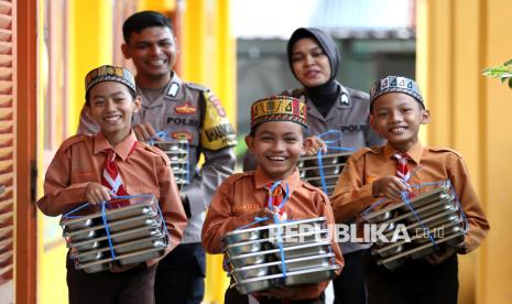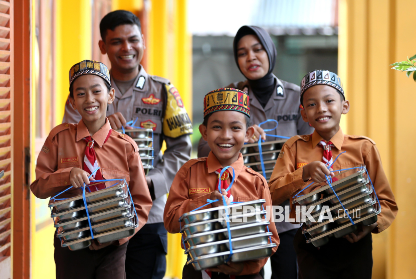 Pelajar bersama personel Polresta Banda Aceh membawa menu Makan Bergizi Gratis (MBG) yang telah di uji tim food security Seksi Kedokteran dan Kesehatan (Sidokkes) di SD Negeri 64 Banda Aceh, Aceh, Jumat (31/10/2025). Tim food security Sidokkes Polresta Banda Aceh melakukan rapid test untuk memeriksa kandungan zat kimia sianida, formalin, nitrit, boraks, arsen dan pencegahan keracunan pada menu MBG sebelum dikonsumsi para pelajar di Kota Banda Aceh.  (FOTO : ANTARA FOTO/Irwansyah Putra)