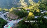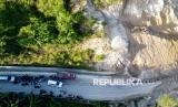 Antrean kendaraan tertahan akibat tanah longsor di Olele, Kabupaten Bone Bolango, Gorontalo, Jumat (31/10/2025). Longsor material tanah dan batu dari lereng bukit tersebut menutupi jalan trans Sulawesi bagian selatan hingga menyebabkan antrean panjang kendaraan yang melintas di daerah itu. (FOTO : ANTARA FOTO/Adiwinata Solihin)