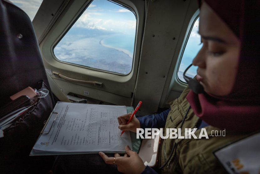 Seorang ilmuwan penerbangan mencatat data penyemaian Natrium Klorida (NaCl) saat pelaksanaan Operasi Modifikasi Cuaca (OMC) menggunakan pesawat Cessna 208 Caravan PK-SNM BNPB di sekitar wilayah udara pesisir utara Kabupaten Rembang, Jawa Tengah, Ahad (2/11/2025). Hingga hari kesembilan atau per Ahad (2/11) penerbangan kedua, BNPB bersama Badan Meteorologi Klimatologi dan Geofisika (BMKG) menghabiskan sebanyak 31 ton NaCl dan 14 ton CaO untuk OMC Jateng dalam rangka penanganan dan mitigasi bencana hidrometeorologi basah di wilayah Kota Semarang dan sekitarnya. (FOTO : ANTARA FOTO/Aji Styawan)