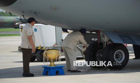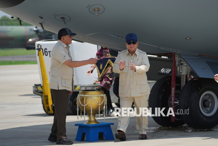 Presiden Prabowo Subianto (kedua kiri) menyiram ban pesawat didampingi Menteri Pertahanan Sjafrie Sjamsoeddin saat seremonial penyerahan Pesawat Airbus A400M di Lanud Halim Perdanakusuma, Jakarta Timur, Senin (3/11/2025). Pesawat angkut Airbus A400M pertama yang tiba dari dua unit yang dipesan Pemerintah Indonesia merupakan alutsista TNI Angkatan Udara yang dapat mengangkut barang berdimensi besar. (FOTO : AP Photo/Achmad Ibrahim)