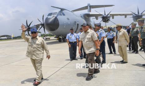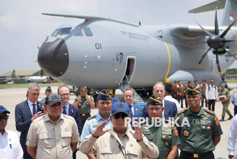 REPUBLIKA.CO.ID, JAKARTA -- Presiden Prabowo Subianto meninjau pesawat Airbus A400M saat kegiatan serah terima pesawat di Lanud Halim Perdanakusuma, Jakarta, Senin (3/11/2025).