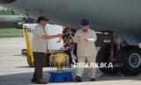 Presiden Prabowo Subianto didampingi Menteri Pertahanan Sjafrie Sjamsoeddin saat seremonial penyerahan Pesawat Airbus A400M di Lanud Halim Perdanakusuma, Jakarta Timur, Senin (3/11/2025). Pesawat angkut Airbus A400M pertama yang tiba dari dua unit yang dipesan Pemerintah Indonesia merupakan alutsista TNI Angkatan Udara yang dapat mengangkut barang berdimensi besar. (FOTO : AP Photo/Achmad Ibrahim)