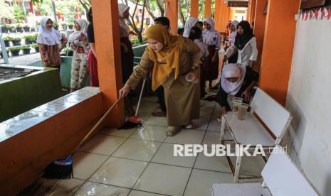 Kegiatan gotong royong membersihkan lingkungan sekolah dari sisa endapan lumpur dan sampah akibat bencana banjir luapan Kali Tenggang serta intensitas hujan tinggi yang melanda di Kota Semarang sejak 12 hari lalu tersebut dilakukan para siswa dan guru agar aktivitas belajar mengajar dapat segera berjalan normal.