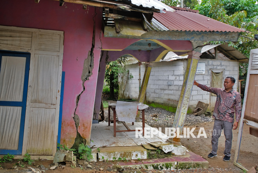 REPUBLIKA.CO.ID, WONOSOBO -- Warga menunjukkan bangunan rumah yang retak dan miring akibat tanah bergerak di Desa Pucungkerep, Kaliwiro, Wonosobo, Jawa Tengah, Selasa (4/11/2025).