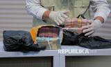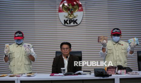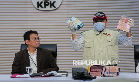 Petugas KPK menunjukan barang bukti hasil tangkap tangan di Provinsi Riau saat menyampaikan keterangan pers terkait pengumuman dan penahanan tersangka di Gedung Merah Putih KPK, Jakarta, Rabu (5/11/2025). KPK secara resmi menetapkan sekaligus menahan tiga tersangka dalam kegiatan tangkap tangan terkait dugaan tindak pidana korupsi pemerasan, permintaan dan penerimaan hadiah atau janji di Pemerintah Provinsi Riau. (FOTO : Republika/Thoudy Badai)