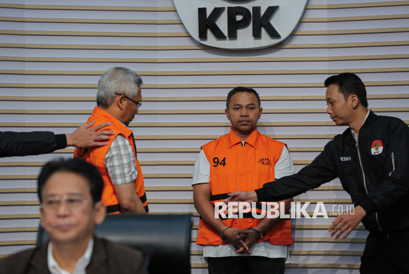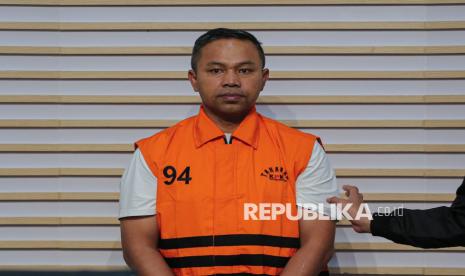 Tersangka Gubernur Provinsi Riau Abdul Wahid mengenakan rompi tahanan saat dihadirkan dalam konferensi pers pengumuman penetapan dan penahanan tersangka di Gedung Merah Putih KPK, Jakarta, Rabu (5/11/2025). KPK secara resmi menetapkan sekaligus menahan tiga tersangka dalam kegiatan tangkap tangan terkait dugaan tindak pidana korupsi pemerasan, permintaan dan penerimaan hadiah atau janji di Pemerintah Provinsi Riau tahun anggaran 2025. (FOTO : Republika/Thoudy Badai)