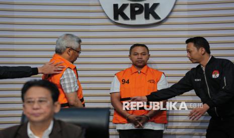 Tersangka Gubernur Provinsi Riau Abdul Wahid (kanan) dan Kepala Dinas Pekerjaan Umum, Penataan Ruang, Perumahan, Kawasan Permukiman dan Pertanahan (PUPR PKPP) Provinsi Riau M Arief Setiawan (kiri) mengenakan rompi tahanan saat dihadirkan dalam konferensi pers pengumuman penetapan dan penahanan tersangka di Gedung Merah Putih KPK, Jakarta, Rabu (5/11/2025). (FOTO : Republika/Thoudy Badai)