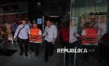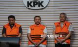 Tersangka Gubernur Provinsi Riau Abdul Wahid (tengah), Kepala Dinas Pekerjaan Umum, Penataan Ruang, Perumahan, Kawasan Permukiman dan Pertanahan (PUPR PKPP) Provinsi Riau M Arief Setiawan (kanan) dan Tenaga Ahli Gubernur Riau Dani M Nursalam (kiri) mengenakan rompi tahanan saat dihadirkan dalam konferensi pers pengumuman penetapan dan penahanan tersangka di Gedung Merah Putih KPK, Jakarta, Rabu (5/11/2025). Ketiga tersangka ditahan selama 20 hari untuk keperluan penyidikan lebih lanjut. (FOTO : Republika/Thoudy Badai)
