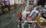 Petugas Unit Penanganan Sampah (UPS) Badan Air membersihkan aliran Kali Krukut dari sampah di kawasan Kebon Melati, Jakarta, Rabu (5/11/2025). Pemerintah Provinsi DKI Jakarta mengimbau masyarakat untuk turut menjaga kebersihan lingkungan dengan tidak membuang sampah ke saluran air. (FOTO : Republika/Prayogi)