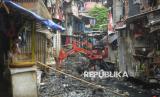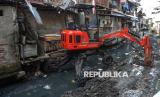 Warga beraktivitas di dekat alat berat yang digunakan untuk membersihkan sedimen aliran Kali Krukut di kawasan Kebon Melati, Jakarta, Rabu (5/11/2025). Kolaborasi antara pemerintah dan warga dinilai penting untuk mewujudkan Jakarta yang bebas banjir dan lebih nyaman ditinggali. (FOTO : Republika/Prayogi)