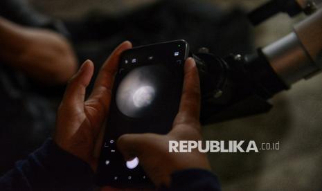 Pengunjung memfoto teleskop saat mengamati Bulan Purnama yang tampak besar atau Supermoon di Taman Ismail Marzuki, Jakarta, Rabu (5/11/2025). Planetarium dan Observatorium Jakarta menggelar kegiatan Piknik Malam Bersama Supermoon serta membuka kesempatan bagi masyarakat untuk menyaksikan fenomena ini melalui teleskop. Dalam kegiatan seru tersebut, peserta terpilih juga berkesempatan mengikuti talkshow astronomi dan menyaksikan pertunjukan Planetarium Mini. Berdasarkan perhitungan astronomis, Bulan Purnama pada 5 November ini bertepatan dengan titik terdekat Bulan terhadap Bumi (perigee). Hal ini menjadikannya Bulan Purnama terbesar tahun ini, atau yang dikenal dengan sebutan Supermoon. Bulan Purnama tersebut tampak sekitar 15 persen lebih terang dan 7 persen lebih besar dibandingkan Bulan Purnama biasa. (FOTO : Republika/Prayogi)