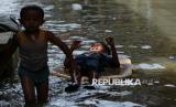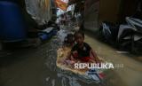 Anak-anak bermain saat banjir rob menggenangi permukimannya di kawasan Muara Angke, Jakarta Utara, Kamis (6/11/2025). Wilayah DKI Jakarta yang terdampak yakni, Kamal Muara, Kapuk Muara, Pluit, Ancol, Marunda, Cilincing, Priok, Kalibaru, Muara Angke dan Penjaringan. (FOTO : Republika/Thoudy Badai)