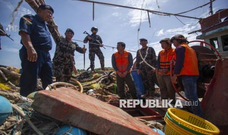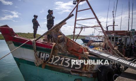REPUBLIKA.CO.ID, BATAM -- Personel Direktorat Jenderal Pengawasan Sumber Daya Kelautan dan Perikanan (PSDKP) menjaga barang bukti kapal ikan asing (KIA) yang diamankan di Pangkalan PSDKP Batam, Kepulauan Riau, Kamis (6/11/2025).
