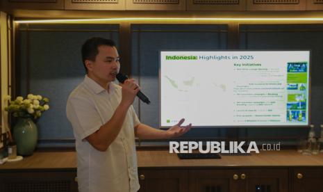 Country Manager inDrive Indonesia Rio Aristo menyampaikan paparan saat konferensi pers di Jakarta, Kamis (6/11/2025). Perusahaan teknologi yang berfokus pada layanan mobilitas inDrive berkomitmen meningkatkan inovasi layanan, penguatan pengalaman pengguna serta perluasan program kemitraan lokal dan inisiatif sosial seiring dengan pengangkatan Rio Aristi sebagai Country Manager inDrive Indonesia. (FOTO : Republika/Thoudy Badai)