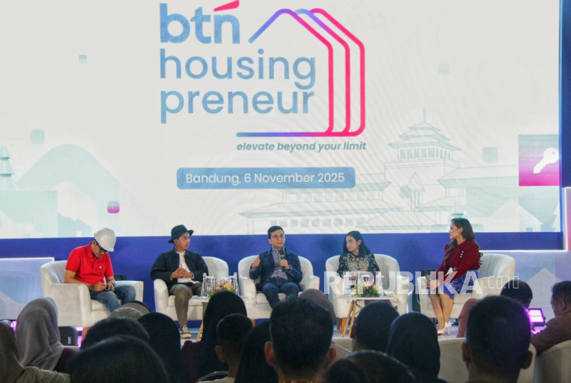 Direktur Risk Management PT Bank Tabungan Negara (Persero) Tbk Setiyo Wibowo (kedua kanan) menjadi pembicara saat Roadshow BTN Housingpreneur 2025 di ITB, Bandung, Kamis (6/11/2025). BTN membuka akses bagi arsitek, pengusaha, dan mahasiswa dari seluruh Indonesia untuk mengembangkan inovasi dan ide di sektor perumahan. Kompetisi BTN Housingpreneur 2025 menargetkan 1.500 peserta dan memperebutkan total hadiah senilai Rp1,5 miliar. (FOTO : Dok Republika)