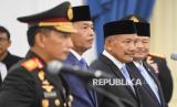 Mantan Kapolri Badrodin Haiti (kedua kanan) dan Idham Aziz (kedua kiri) bersama Wamenko Kumham Imipas Otto Hasibuan (kanan) dan Kapolri Jenderal Pol. Listyo Sigit Prabowo (kiri) mengikuti pelantikan anggota Komisi Percepatan Reformasi Polri di Istana Merdeka, Jakarta, Jumat (7/11/2025). Presiden Prabowo Subianto melantik 10 anggota Komisi Percepatan Reformasi Polri. (FOTO : ANTARA FOTO/Hafidz Mubarak A)