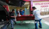 Petugas Polisi bersama pihak keluarga mengambil peti jenazah Muhammad Farhan di ruang Instalasi Kedokteran Forensik RS Polri, Jakarta, Sabtu (8/11/2025). Polda Metro Jaya mengungkapkan dua kerangka manusia yang ditemukan di Gedung Astra Credit Companies (ACC) yang terbakar adalah Reno Syahputra Dewo dan Muhammad Farhan yang sebelumnya dinyatakan hilang pascaaksi demontrasi pada 29 Agustus lalu di Kwitang setelah dilakukan kecocokan DNA. Reno dan Farhan diduga meninggal karena menjadi korban kebakaran di gedung tersebut. Dua jenazah tersebut saat ini telah diserahkan kepada pihak keluarga dan akan dimakamkan di Surabaya, sementara jenazah Muhammad Farhan akan dimakamkan di Tanjung Priok, Jakarta. (FOTO : Republika/Thoudy Badai)