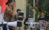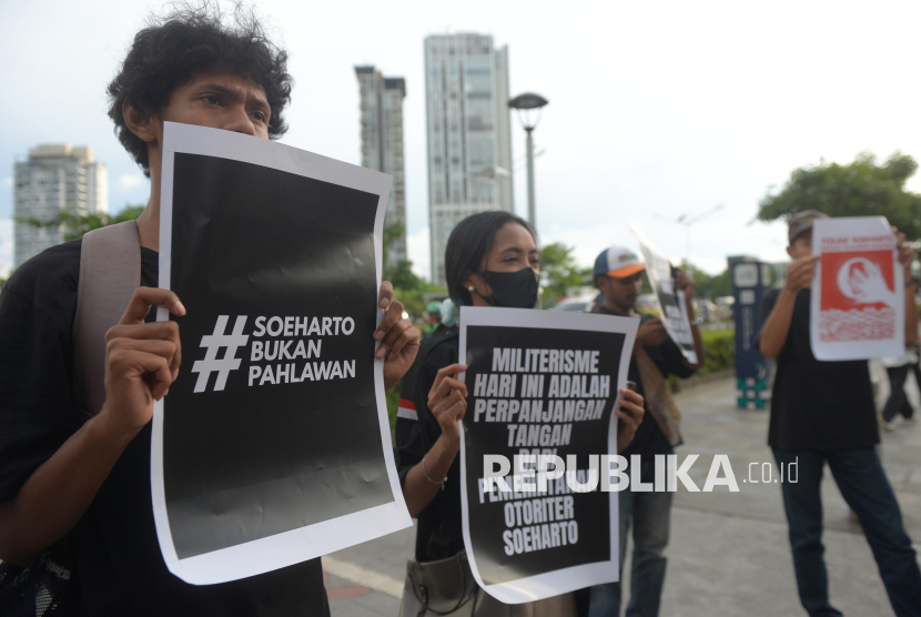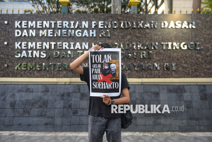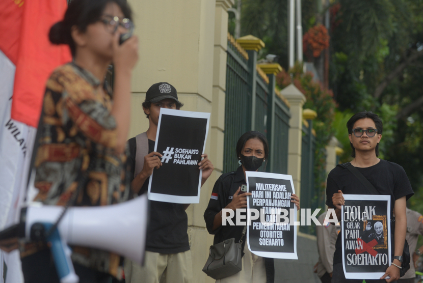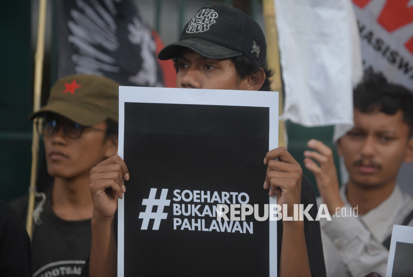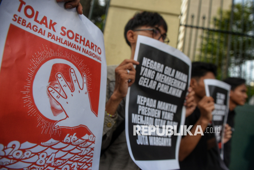 Sejumlah orang menggelar unjuk rasa menolak pemberian gelar pahlawan kepada mantan Presiden Soeharto di depan Kantor Kementerian Kebudayaan, Jakarta, Senin (10/11/2025). Para pengunjuk rasa menilai Soeharto tidak layak menerima gelar tersebut karena dianggap memiliki catatan pelanggaran hak asasi manusia serta praktik korupsi, kolusi, dan nepotisme (KKN) selama 32 tahun masa kepemimpinannya. (FOTO : Republika/Prayogi)