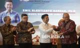 Wakil Gubernur Jawa Timur Emil Elestiyanto Dardak (kedua kanan) menerima cenderamata dari Presiden Direktur Lion Air Daniel Putu Kuncoro Adi (kanan) didampingi Direktur PT Surya Dhoho Investama Maksin Arisandi (kiri) dan Bupati Kediri Hanindhito Himawan Pramana (kedua kiri) saat upacara penerbangan perdana di Bandara Dhoho Kediri, Jawa Timur, Senin (10/11/2025). Bandara berstandar internasional yang sebelumnya mengalami kekosongan penerbangan selama empat bulan tersebut kembali beroperasi dengan penerbangan perdana maskapai Super Air Jet yang membuka rute Kediri-Jakarta sehingga diharapkan mampu mendukung pertumbuhan ekonomi dan pariwisata di Jawa Timur bagian selatan. (FOTO : ANTARA FOTO/Prasetia Fauzani)