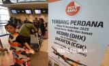 Calon penumpang mengantre cek in di Bandara Dhoho Kediri, Jawa Timur, Senin (10/11/2025). Bandara berstandar internasional yang sebelumnya mengalami kekosongan penerbangan selama empat bulan tersebut kembali beroperasi dengan penerbangan perdana maskapai Super Air Jet yang membuka rute Kediri-Jakarta sehingga diharapkan mampu mendukung pertumbuhan ekonomi dan pariwisata di Jawa Timur bagian selatan. (FOTO : ANTARA FOTO/Prasetia Fauzani)
