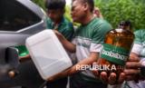 Tim pendukung Bobibos menunjukan bahan bakar Bobibos Energi Merah Putih seusai konferensi pers terkait Bobibos Energi Merah Putih di Bumi Sultan Jonggol, Bogor, Jawa Barat, Selasa (11/11/2025). Bahan bakar alternatif bernama Bobibos, yang diklaim memiliki kadar oktana (RON) tinggi dan emisi rendah, diharapkan menjadi solusi potensial untuk menekan ketergantungan Indonesia terhadap energi impor. Inovasi energi terbarukan ramah lingkungan ini lahir dari kreativitas anak bangsa. Bobibos memiliki dua jenis bahan bakar, yakni bensin dan solar, yang memanfaatkan jerami sebagai bahan baku. (FOTO : Republika/Prayogi)