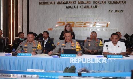 Kapolda Metro Jaya Irjen Pol Asep Edi Suheri (kanan) menyampaikan keterangan terkait kasus ledakan SMAN 72 di Polda Metro Jaya, Jakarta, Selasa (11/11/2025). Hasil penyelidikan sementara terduga pelaku berinisial ABH yang terlibat dalam ledakan tersebut diketahui merupakan seorang siswa SMA aktif yang bertindak secara mandiri dan tidak terhubung dengan jaringan teror tertentu. (FOTO : Bayu Adji P/Republika)