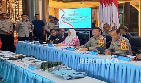Kapolda Metro Jaya Irjen Pol Asep Edi Suheri (ketiga kanan) didampingi Direktur Reskrimum Kombes Pol Iman Imanuddin (kedua kanan), Kabid Humas Kombes Pol Budi Hermanto (keempat kiri), Dirresiber Kombes Pol Roberto Gomgom Manorang Pasaribu (kanan) dan Ketua KPAI Margaret Aliatul Maimunah (kelima kiri) menyampaikan keterangan terkait kasus ledakan SMAN 72 di Polda Metro Jaya, Jakarta, Selasa (11/11/2025). Hasil penyelidikan sementara terduga pelaku berinisial ABH yang terlibat dalam ledakan tersebut diketahui merupakan seorang siswa SMA aktif yang bertindak secara mandiri dan tidak terhubung dengan jaringan teror tertentu. (FOTO : ANTARA FOTO/Reno Esnir)