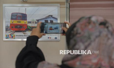 Pengunjung mengamati foto kereta yang dipajang dalam Mini Museum di Stasiun Jakarta Kota, Rabu (12/11/2025). Kegiatan ini juga menjadi ajang untuk mengenang sejarah panjang transportasi rel di Indonesia, mengingat selama hampir dua dekade rangkaian-rangkaian tersebut setia mengantar jutaan penumpang setiap harinya. (FOTO : Republika/Prayogi)