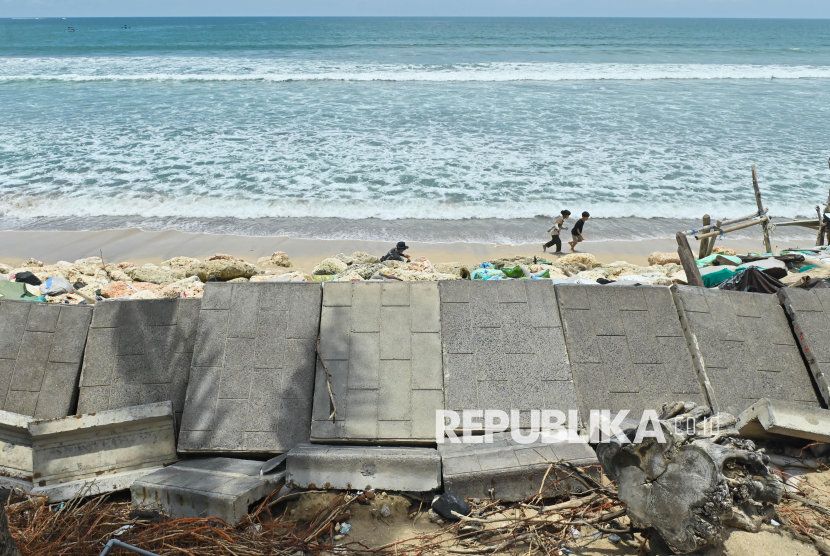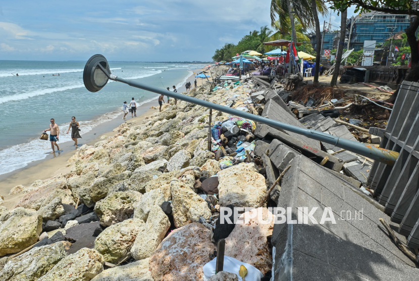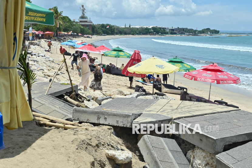REPUBLIKA.CO.ID, BADUNG -- Wisatawan berjalan di dekat jalur pejalan kaki yang rusak di Pantai Kuta, Badung, Bali, Rabu (12/11/2025).