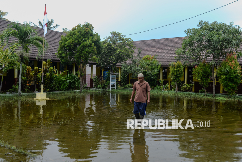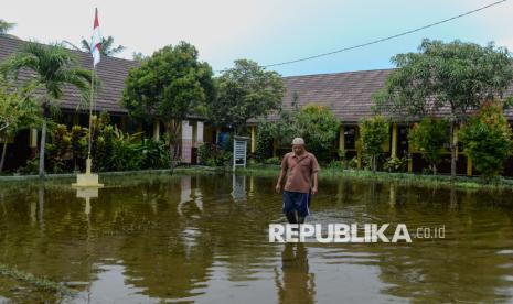 REPUBLIKA.CO.ID, SERANG -- Penjaga sekolah melintasi banjir di area halaman SD Negeri Pamarican 2, Kota Serang, Banten, Kamis (13/11/2025).