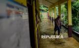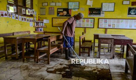 Penjaga sekolah membersihkan sisa banjir di dalam kelas di SD Negeri Pamarican 2, Kota Serang, Banten, Kamis (13/11/2025). Sebanyak dua sekolah dasar di daerah tersebut terdampak banjir sejak Senin (10/11) akibat posisi sekolah yang lebih rendah dari jalan disertai buruknya saluran drainase sehingga mengakibatkan kegiatan belajar mengajar terpaksa dilaksanakan secara daring. (FOTO : ANTARA FOTO/Muhammad Bagus Khoirunas)