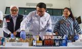 Kepala Badan Pengawas Obat dan Makanan (BPOM) Taruna Ikrar (tengah) didampingi Kepala Balai Besar POM di Jakarta Sofiyani Chandrawati Anwar (kiri) dan Kadis Perindustrian, Perdagangan, dan Koperasi UKM Provinsi DKI Jakarta Elizabeth Ratu Rante Alo (kanan) menunjukkan sejumlah produk farmasi ilegal saat rilis hasil penindakan gudang sediaan farmasi ilegal di Kantor BBPOM di Jakarta, Cilangkap, Jakarta Timur, Kamis (13/11/2025). BPOM bersama Polda Metro Jaya berhasil mengungkap gudang sediaan farmasi ilegal berskala besar di wilayah Jakarta Barat dengan menyita barang bukti senilai total Rp2,74 miliar yang terdiri dari 15 item obat tanpa izin edar/TIE (4.027 kemasan), 29 item obat bahan alam (OBA) TIE (3.151 kemasan), serta 21 item (1.899 kemasan) suplemen kesehatan TIE dari gudang yang telah beroperasi selama empat tahun tersebut dan menangkap seorang pelaku yang berperan sebagai supplier berinisial MU. (FOTO : ANTARA FOTO/Indrianto Eko Suwarso)