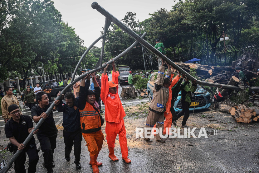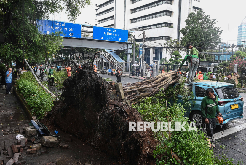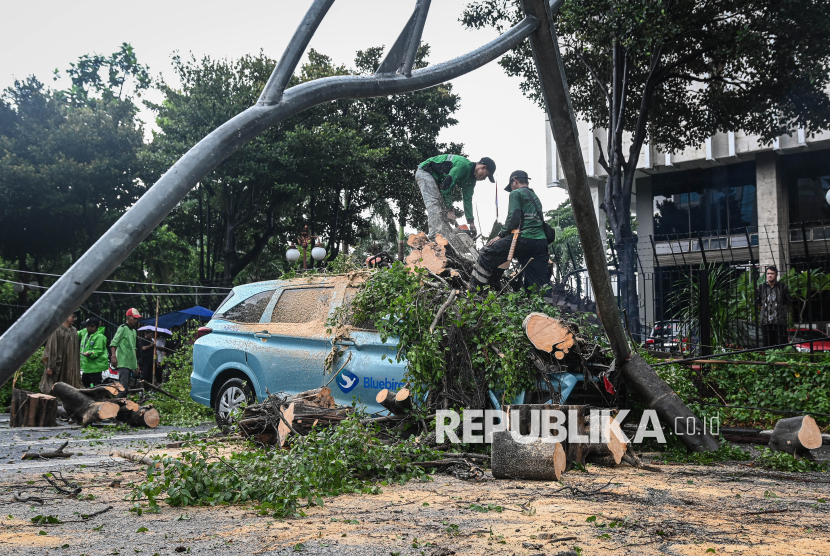 REPUBLIKA.CO.ID, JAKARTA -- Petugas Dinas Pertamanan dan Hutan Kota DKI Jakarta mengevakuasi pohon tumbang yang menimpa mobil taksi di Jalan Dr. Wahidin Raya, Sawah Besar, Jakarta, Jumat (14/11/2025).