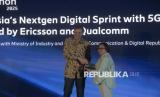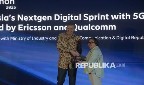 President Director of Ericsson Indonesia, Singapore, Philippines, and Brunei Daniel Ode memberikan cinderamata kepada Direktur Kecerdasan Artifisial dan Ekosistem Teknologi Baru Kementerian Komunikasi dan Digital Aju Widya Sari dalam acara pengumuman pemenang Hackathon 2025 di Garuda Sparks Innovation Hub, Jakarta, Jumat (14/11/2025). Ajang Hackathon 2025 yang merupakan kolaborasi antara Ericsson, Qualcomm, Komdigi, dan Kemenperin ini bertujuan untuk memperkuat ekosistem inovasi berbasis 5G dan AI di Indonesia serta mendukung terwujudnya visi Indonesia Digital 2045. (FOTO : Republika/Prayogi)