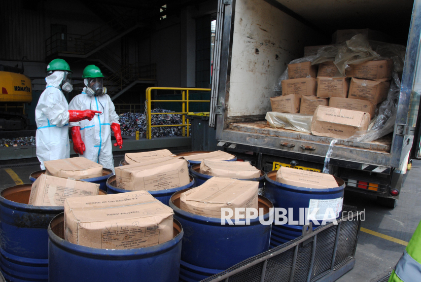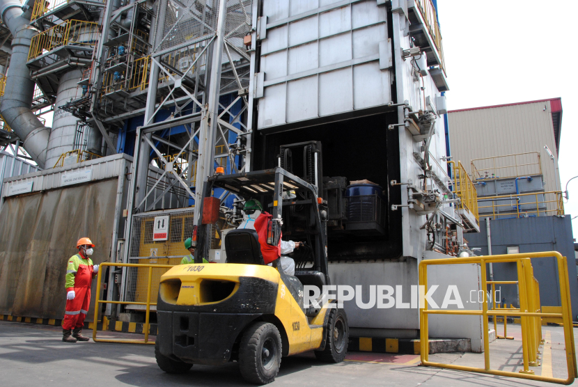 REPUBLIKA.CO.ID, BOGOR -- Petugas dengan alat pelindung diri (APD) lengkap bersiap memusnahkan kotak karton berisi udang yang terkontaminasi radioaktif di PT Prasadha Pamunah Limbah Industri (PPLI), Klapanunggal, Bogor, Jawa Barat, Sabtu (15/11/2025).