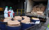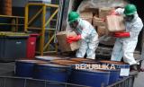 Petugas dengan alat pelindung diri (APD) lengkap mengangkat kotak karton berisi udang yang terkontaminasi radioaktif saat pemusnahan di PT Prasadha Pamunah Limbah Industri (PPLI), Klapanunggal, Bogor, Jawa Barat, Sabtu (15/11/2025). Kementerian Lingkungan Hidup memusnahkan sekitar 5,7 ton atau 494 kotak karton udang yang terkontaminasi zat radiokatif Cesium-137 (Cs-137) yang berasal dari Cikande, Serang, Banten tersebut dengan cara pembakaran atau insinerasi secara bertahap. (FOTO : ANTARA FOTO/Arif Firmansyah)
