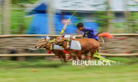 REPUBLIKA.CO.ID, LUMAJANG -- Joki memacu sapi saat mengikuti karapan sapi di Lumajang, Jawa Timur, Sabtu (15/11/2025).