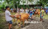 Sejumlah peserta bersiap sebelum mengikuti karapan sapi di Lumajang, Jawa Timur, Sabtu (15/11/2025). Karapan yang diikuti sebanyak 100 peserta dari berbagai daerah di Jawa Timur, seperti Jember, Probolinggo, dan Madura tersebut sebagai upaya menjaga tradisi sekaligus menjalin silaturahmi antarpelaku karapan yang biasa digelar saat akhir pekan. (FOTO : ANTARA FOTO/Irfan Sumanjaya)