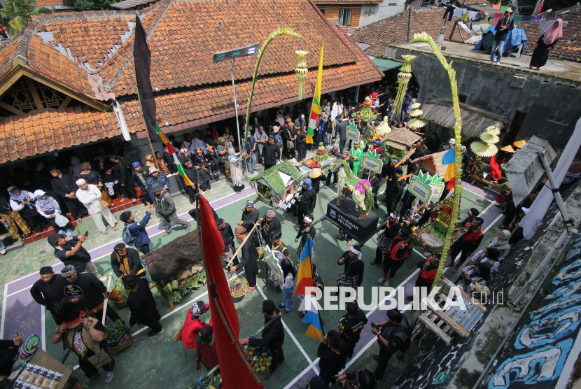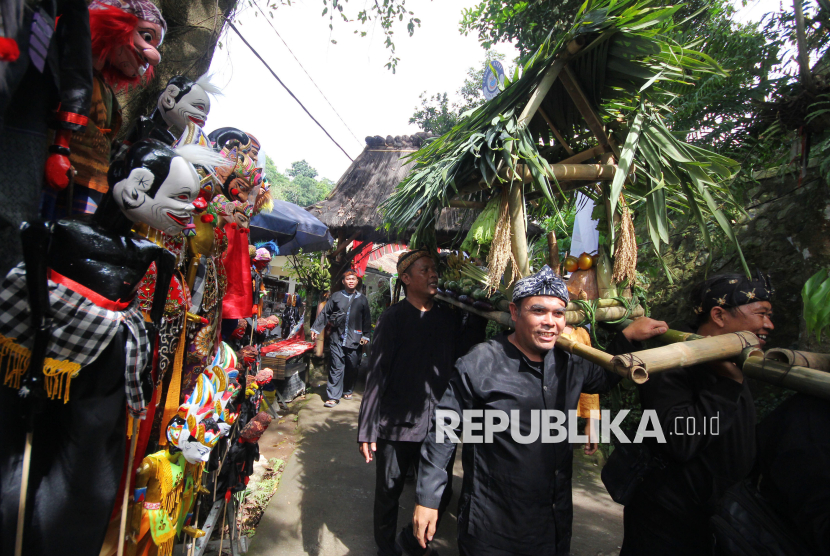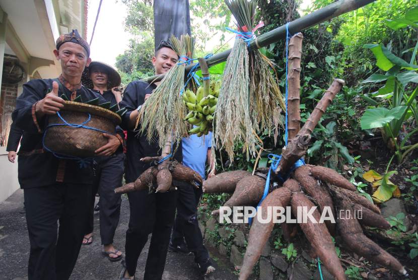 REPUBLIKA.CO.ID, CIMAHI -- Peserta membawa jampana berisi makanan dan hasil bumi menuju kampung adat Cireundeu pada Festival Cireundeu 2025, di Cimahi, Sabtu (15/11/2025).