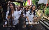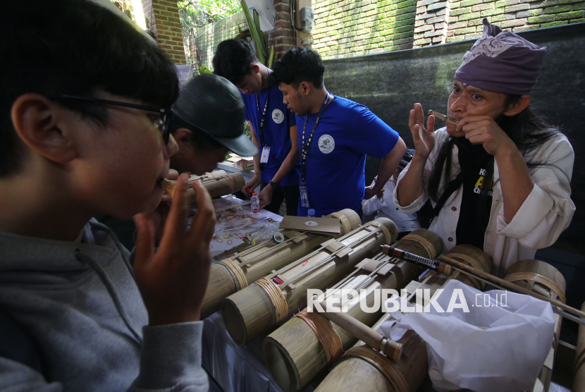 Pengunjung mengikuti workshop memainkan musik tradisi pada Festival Cireundeu 2025, di kampung adat Cireundeu di Cimahi, Sabtu (15/11/2025). Kegiatan tahunan ini merupakan upaya pelestarian seni budaya tradisi khusunya diversifikasi pangan. (FOTO : Edi Yusuf)