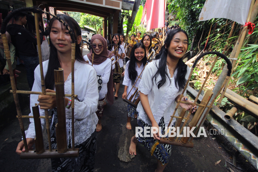 Para remaja memainkan angklung menuju kampung adat Cireundeu saat Festival Cireundeu 2025, di Cimahi, Sabtu (15/11/2025). Kegiatan tahunan ini merupakan upaya pelestarian seni budaya tradisi dan diversifikasi pangan khususnya berbahan singkong. (FOTO : Edi Yusuf)